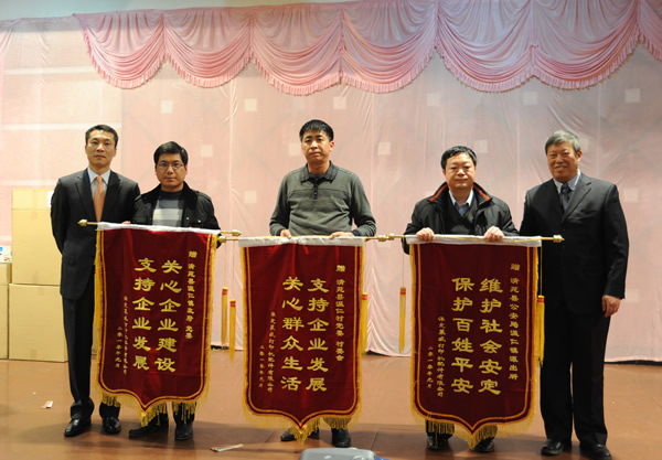 大会上,保定莱盛徐虎民厂长做了2009年工作总结报告。莱盛石磊总经理,杜海泳副总经理与崔凤来总工程师先后为保定莱盛全体员工致以诚挚的新年祝福,并与徐厂长一起,为评选出的:“2009年度五好车间员工”、“部门优秀员工”、“优秀干部”、“设备革新奖”、“新产品开发奖“得主颁发了荣誉证书及奖品。 石总和徐厂长还向保定市温仁镇政府、温仁镇派出所、温仁村党支部赠送了锦旗,以感谢他们多年以来对工厂快速发展给予的支持与帮助。